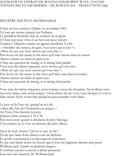 Dans la salle d’audience honorable, le juge a frappé de son marteau Pour montrer que tout est égal et que les tribunaux sont au sommet du monde Et la corde tachée de sang, le costume, la chaise et la baguette Ont tous été jetés aux chats pour qu’ils les déchirent et les brûlent Et les chats ne savaient pas pourquoi ils étaient là et ils s’en moquaient Et les gens dans la rue ont à peine levé les yeux Et les journaux ont imprimé l’histoire en première page Puis ils ont enterré l’histoire quand l’histoire était terminée