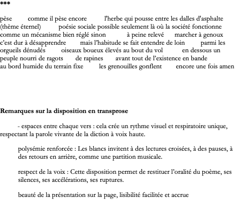 - Respect de la structure : La disposition des vers, les retours à la ligne, les blancs, sont bien reproduits, ce qui est essentiel pour la poésie contemporaine.
