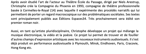 Ce n’est pas la première fois que je publie, ou que je propose un texte à la lecture. J’ai écrit plusieurs pièces de théâtre qui ont été publiées chez Espaces34, des pièces ados/adultes, et des textes jeune public aussi. Je dirige une compagnie de théâtre pour laquelle j’écris et je mets en scène. Et de Dérives, j’en ai fait un spectacle en deux parties. La première partie, qui se nomme Terre asphalte, est donné sous forme de concert poétique, et le deuxième (Pavillon nerfs) sous forme de performances immobile. J’ai aussi un texte de poésie qui a été édité chez Color Gang et qui s’appelle Happé.