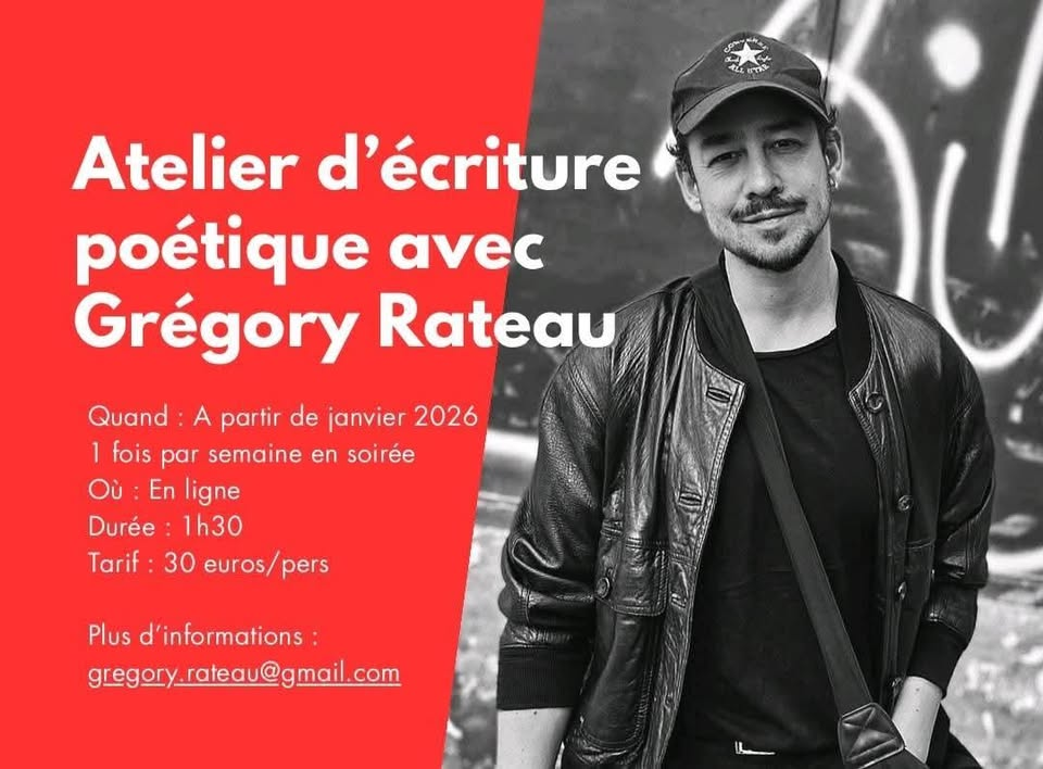 "Chers amis. Vous pouvez encore nous rejoindre tous les jeudis (20h, heure française) pour mon atelier d'écriture poétique en ligne en partenariat avec Strophe.fr (qui partage en ce moment sur son site, chaque semaine, les poèmes issus de l'atelier). Nous sommes déjà un petit groupe de passionnés (dont certains déjà publiés, une directrice d'un prix d'importance mais aussi des amateurs désireux d'explorer la langue). Après l'atelier, les poèmes sont d'ailleurs retravaillés et je fais un retour personnalisé pour chacun avant de reprendre le jeudi suivant. Nous découvrons ensemble toutes les formes d'écriture, dans un climat fraternel et ludique (sans discrimination géographique aucune). Je souhaite inviter régulièrement des poètes à intervenir dans nos échanges, des directeurs de revue, des éditeurs peut-être... N'hésitez pas à partager et à le recommander à vos relations. Pour toute information me contacter : gregory.rateau@gmail.com"