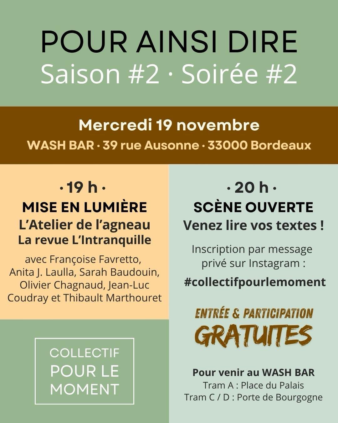 5/ Le collectif "Pour le moment" situé à Bordeaux est reparti pour une nouvelle saison : après les éditions de La Crypte, il recevra "l'atelier de l'agneau" au Washbar le mercredi 19 novembre prochain