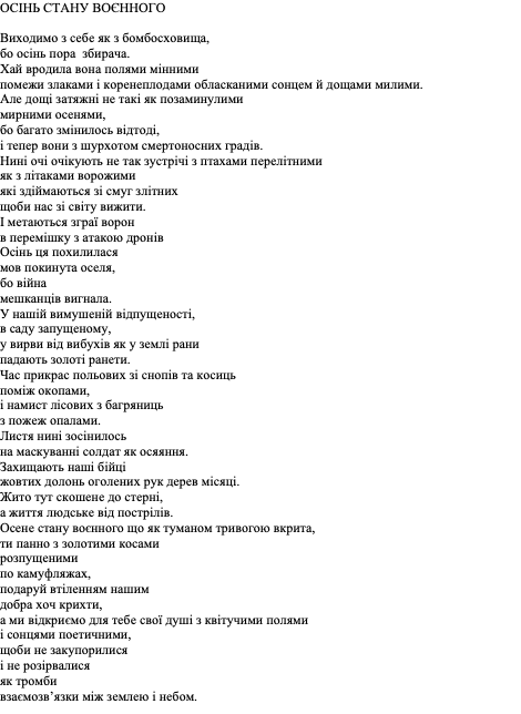із камуфляжів пікселі і листя осіннє та стрічки барвисті з сіток маскувальних прикрашають ці вірші,