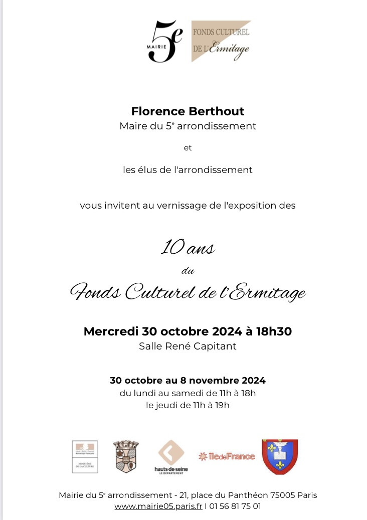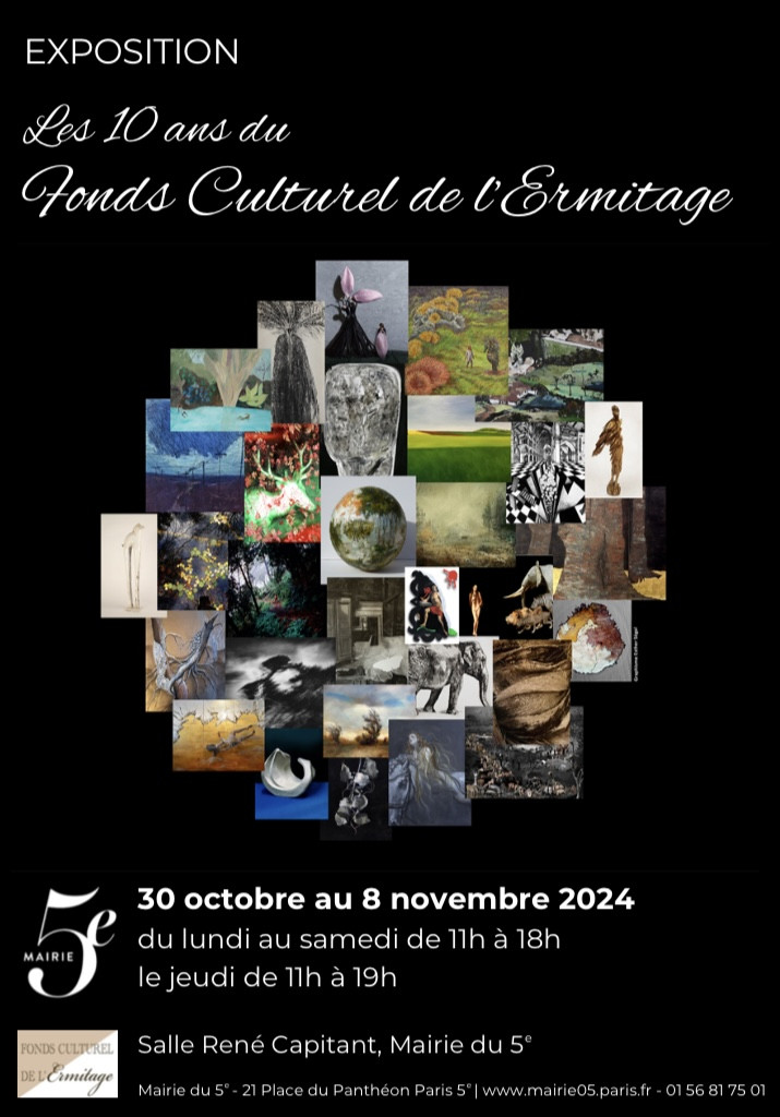 Je fais partie des artistes qui exposeront pour Les 10 ans du Fonds Culturel de l'Ermitage du 30 octobre au 8 novembre 2024 à la salle René Capitant Paris 5ème.