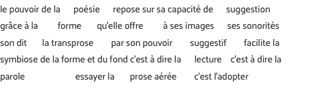 Le pouvoir de la poésie repose sur sa capacité de suggestion grâce à la forme qu’elle offre, à ses images, ses sonorités, son dit. La transprose, par son pouvoir suggestif, facilite la symbiose de la forme et du fond, c’est à dire la lecture, c’est à dire la parole. Essayer la prose aérée c’est l’adopter !