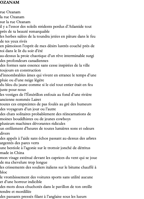 Ozanam est un poème ambitieux et abouti, qui réussit à métamorphoser une rue en univers. Il allie la précision du réel (« crissements des souliers italiens ») et l’ouverture vers l’infini (« constellations »), avec une langue à la fois crue et lyrique. La forme du catalogue, souvent difficile à maîtriser, est ici au service d’une vision poétique puissante, où le lecteur est invité à reconstruire le sens à travers les images accumulées.
