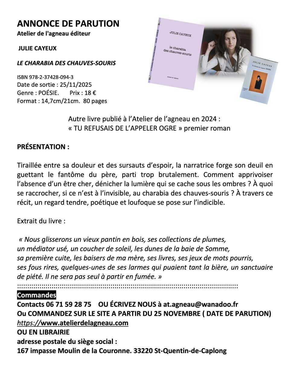 1/ Une sortie annoncée et à ne pas manquer, celle du dernier récit poétique de Julie Cayeux, aux éditions "L'atelier de l'agneau", Le charabia des chauves-souris.