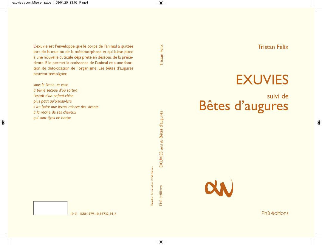- Tristan Felix dédicacera Exuvies, suivi de Bêtes d'Augures le samedi 22 novembre de 14 h 30 à 17 h 30