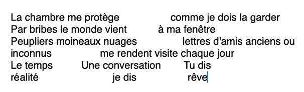 résistance de certains textes / certains poèmes / comme / il aura suffi / de pierre lamarque / résistent à la transprose car leur rythme exige une disposition verticale / poésie en marches d’escalier