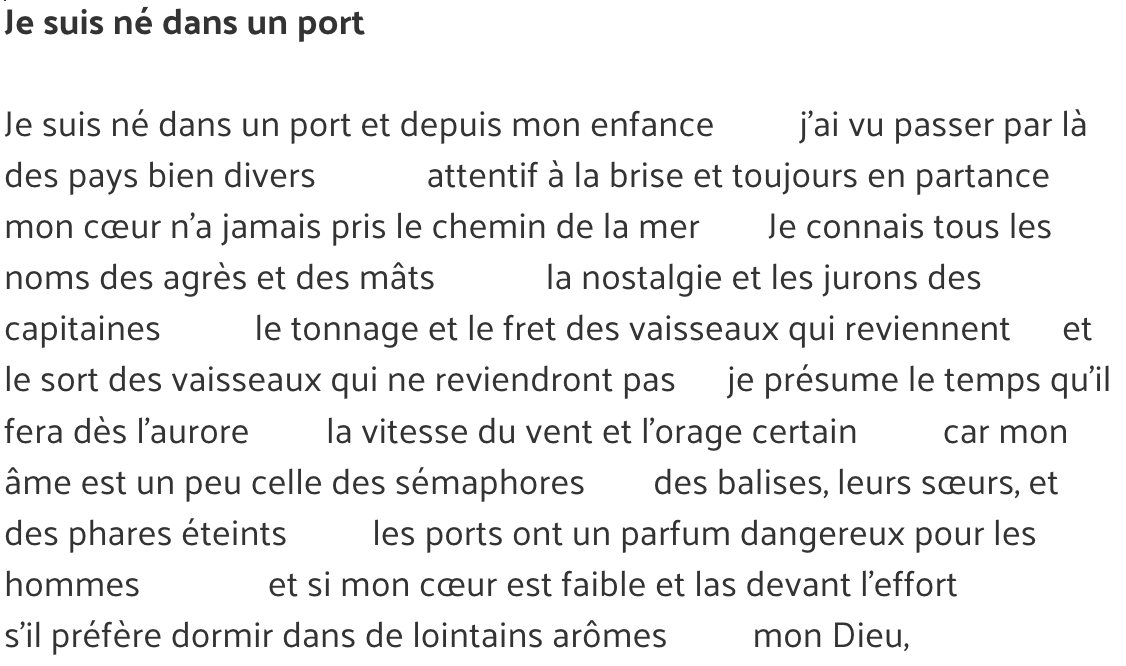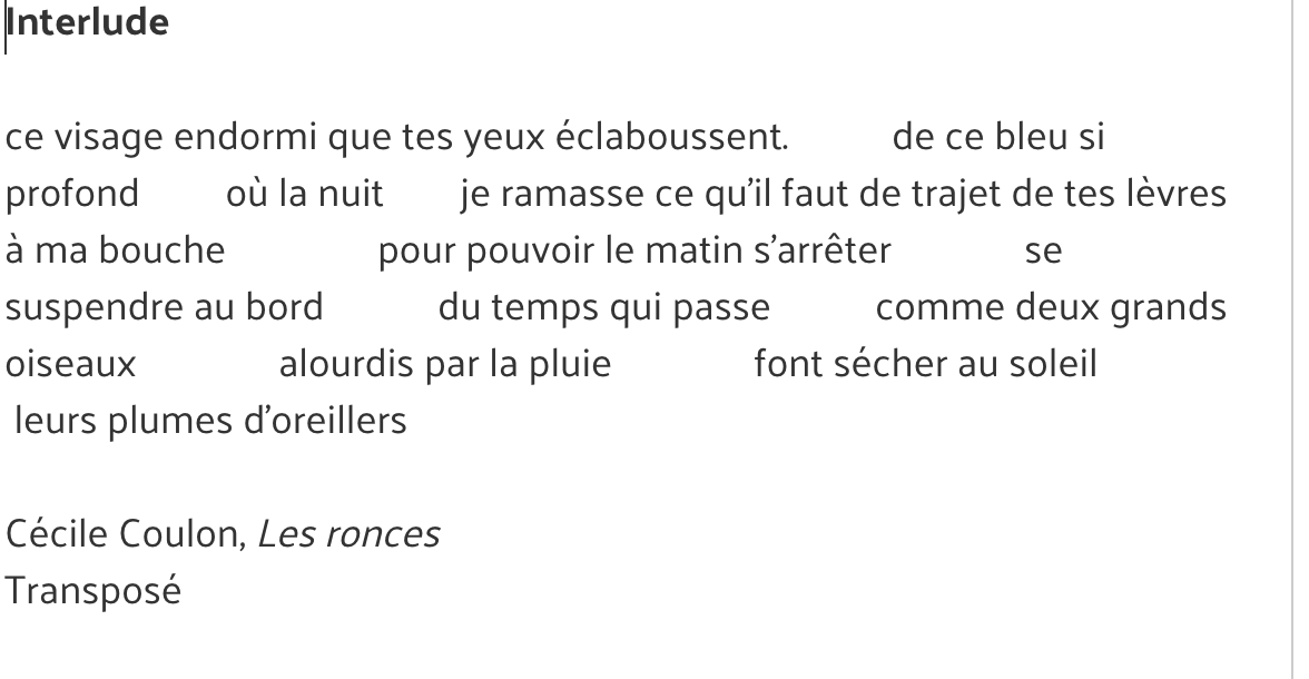 Nous sommes plusieurs à Lpb à aimer en poésie la présentation que nous appelons présentation en « Transprose » - le terme a été inventé en juin 2022 par Patrick Modolo .