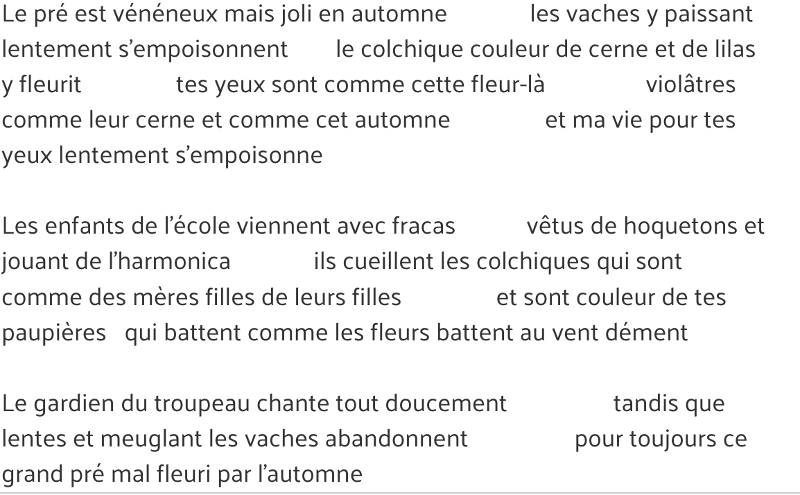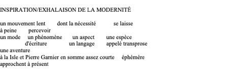 Textes en transprose = disparition de majuscules inutiles / disparition de ponctuations inutiles / lecture souple, agréable. La transprose donne de l'air et du souffle à la prose en poésie.