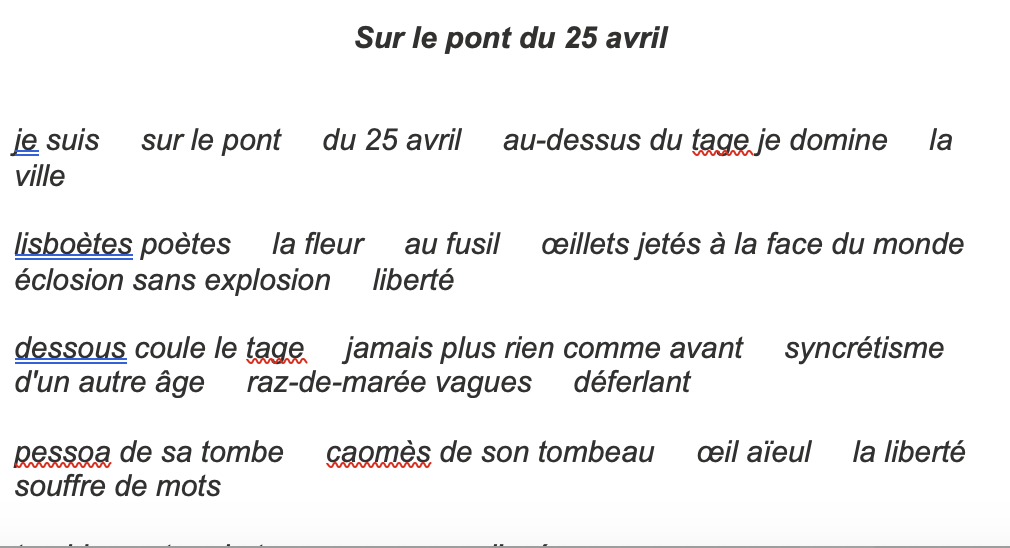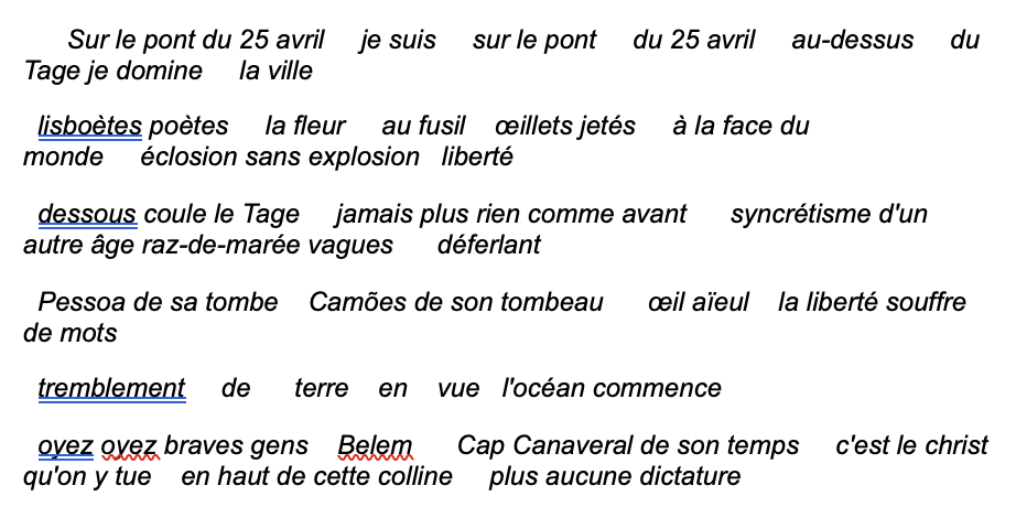 Air Le lexique tel que vous le proposez est un objet poétique en lui-même, en plus d'être didactique. Ce Pont du 25 avril pourrait être un exemple, en partant de la version versifiée classiquement tel que publiée dans la revue à laquelle Patrick s'est associé pour lire son texte ce jour-là. La différence de qualité visuelle m'a sauté aux yeux quand j'ai ouvert cette pièce jointe, et cela permettrait de bien mettre en lumière les bénéfices de la transprose, en plus d'y décrire ces nouveaux objets lexicaux.
