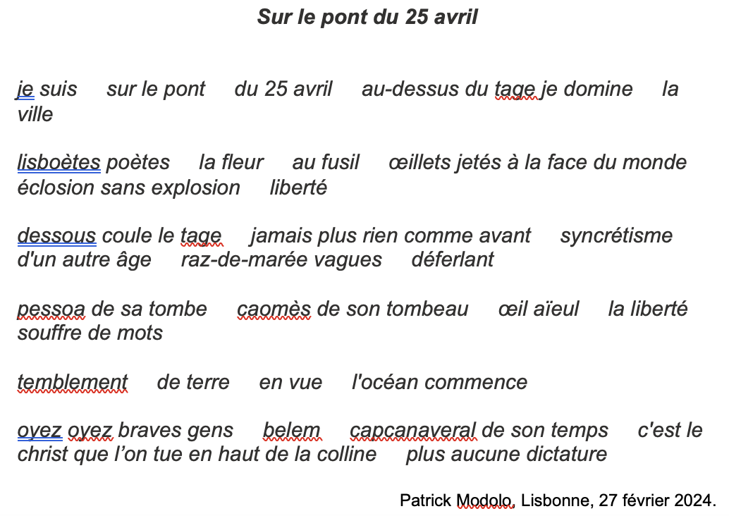 Lors d’un séjour à Lisbonne, en février 2024, je fus emporté par la Poésie de cette ville, qui glorifie ses écrivains et ses poètes, Pessoa, Saramago, Camoes en tête. Et par ce Pont du 25 avril, riche d’Histoire. Une Histoire qui allait fêter dans quelques semaines son demi-siècle. L’Histoire d’un peuple qui reconquiert sa liberté grâce à son armée. L’armée qui par un coup d’état renverse la dictature de Salazar en ce 25 avril 1974, pour installer une nouvelle démocratie et redonner le pouvoir au peuple. Du jamais vu, ou presque, dans la longue histoire des coups d’état.